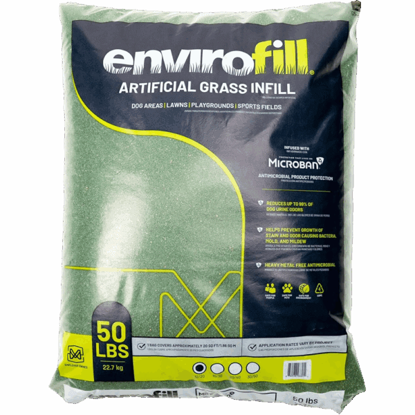 Green Envirofill 12/20 – 50 lbs Envirofill ® makes artificial turf look and feel great. It’s tough enough for any application, and it’s safe. Envirofill is American-made and uses non-toxic components. No wonder it’s the favorite of landscape experts for everything from playgrounds and putting greens to residential lawns and pet areas.