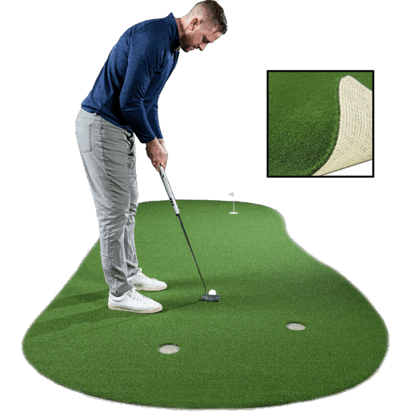 Premium Woven Nylon Turf: Crafted with 100% woven nylon and a natural rubber-coated backing, our mat is safe for use on hard surfaces or in-ground installation. Featuring Precut Challenging Holes for a Professional and Engaging Golf Practice Experience. Robust and Heavy-Duty: Built to last with tough construction, ensuring durability that withstands rigorous use. Elevate your experience with a mat that stands the test of time. Delivers Professional-Level Performance: Elevate your game with a mat that mirrors the standards of a professional golf course, providing golfers with an unparalleled practice experience. Comes with cups and flags. Top Features of Our Putting Green Practice Mats True roll nylon UV stable for outdoors. Flat-lay backing. Flexible sizing. Pairs with a full golf mat series. Best Practice Use Cases Office, garage, and outdoor practice centers.